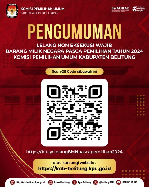 #TemanPemilih, Berikut ini adalah Pengumuman Lelang Non Eksekusi Wajib Barang Milik Negara Nomor : 18/RT.01.3-Pu/1902/2025 tanggal 17 Oktober 2025. Pengumuman selengkapnya dapat diunduh di DI SINI. Penawaran Lelang diajukan melalui domain www.lelang.go.id #KPUBelitung #KPUMelayani ....