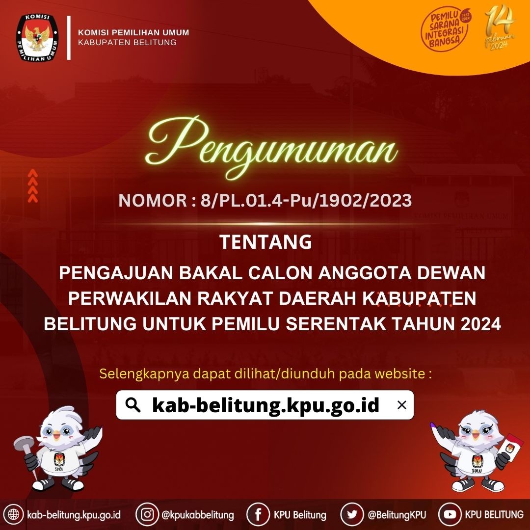 ##TemanPemilih, Berikut adalah Pengumuman Nomor: 8/PL.01.4-PU/1902/2023 tentang Pengajuan Bakal Calon Anggota Dewan Perwakilan Rakyat Daerah Kabupaten Belitung Untuk Pemilu Serentak Tahun 2024 sebagai Pengajuan Bakal Calon Anggota DPRD Kabupaten Belitung.