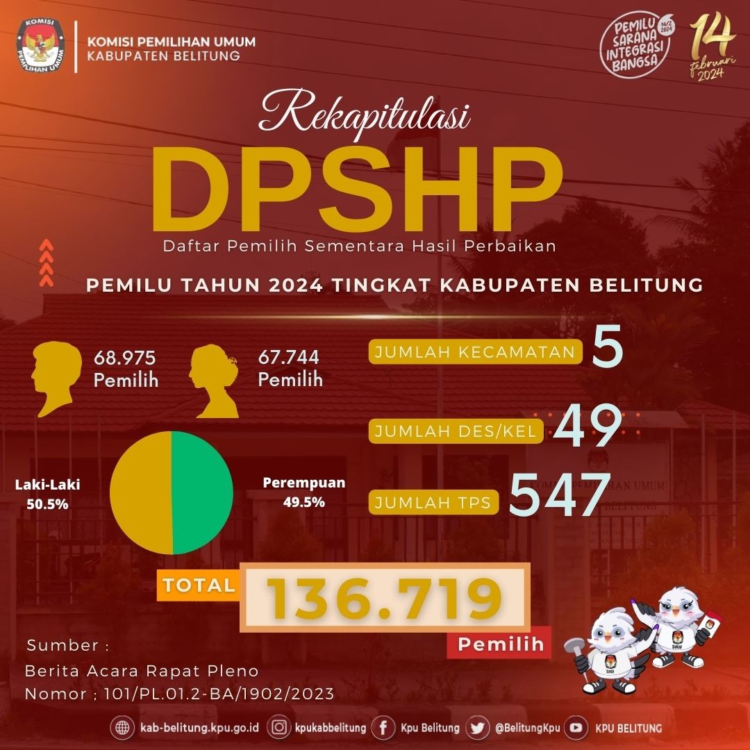 #TemanPemilih, Berikut adalah Infografis Rekapitulasi Daftar Pemilih Sementara Hasil Perbaikan (DPSHP) Pemilu tahun 2024 tingkat Kabupaten Belitung.