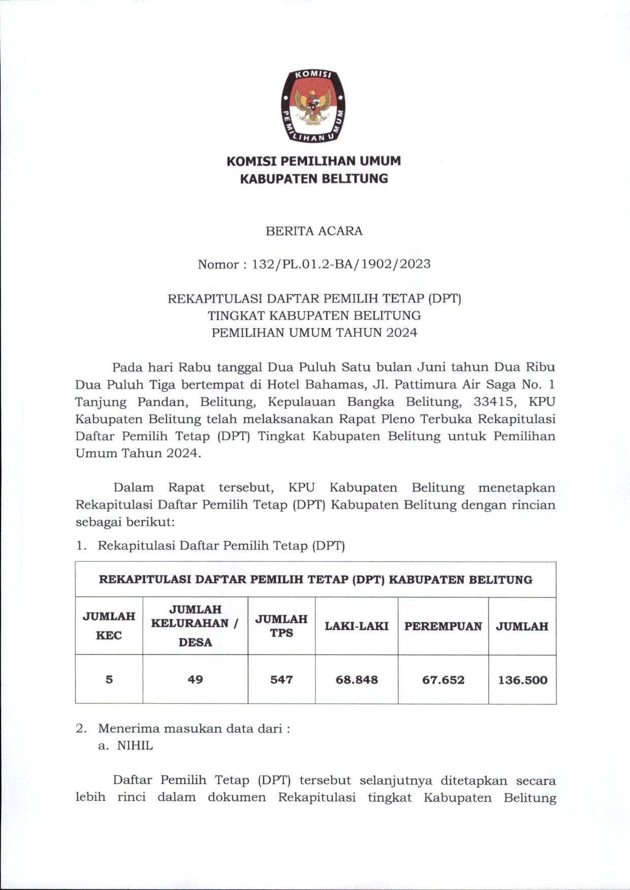 #TemanPemilih, Berikut adalah Berita Acara Rekapitulasi Daftar Pemilih Tetap (DPT) Tingkat Kabupaten Belitung Pemilihan Umum Tahun 2024