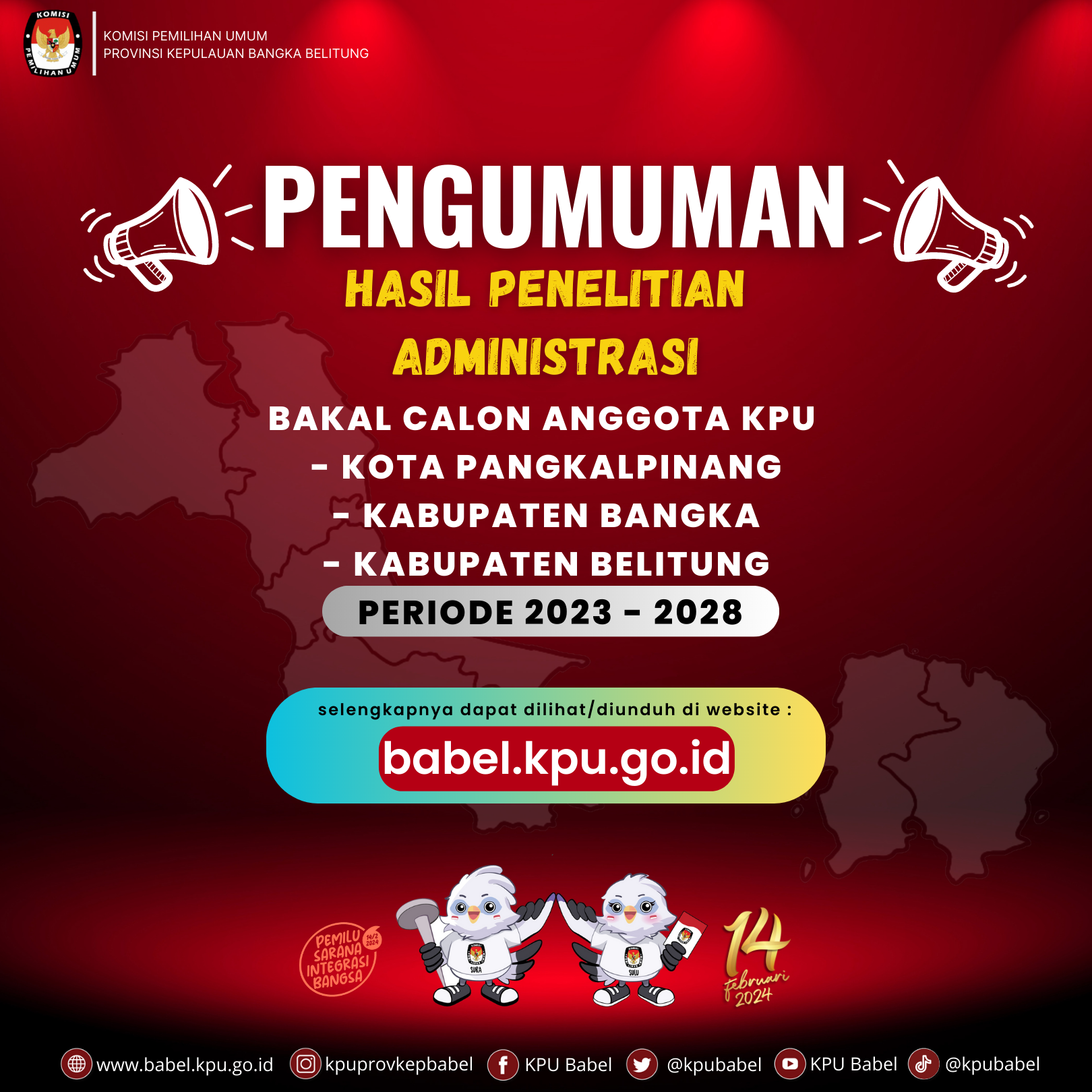 PENGUMUMAN HASIL PENELITIAN ADMINISTRASI BAKAL CALON ANGGOTA KPU KOTA PANGKALPINANG, KABUPATEN BANGKA DAN KABUPATEN BELITUNG PERIODE 2023-2028