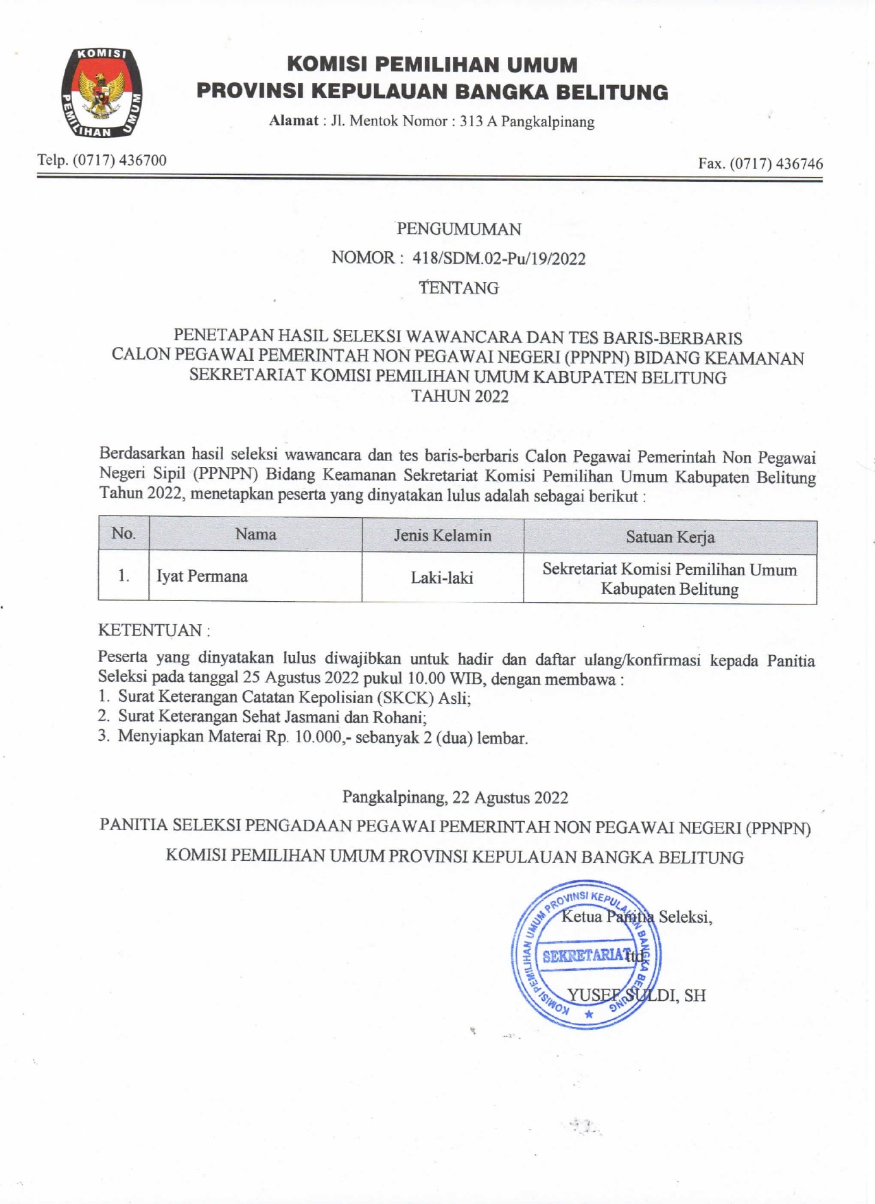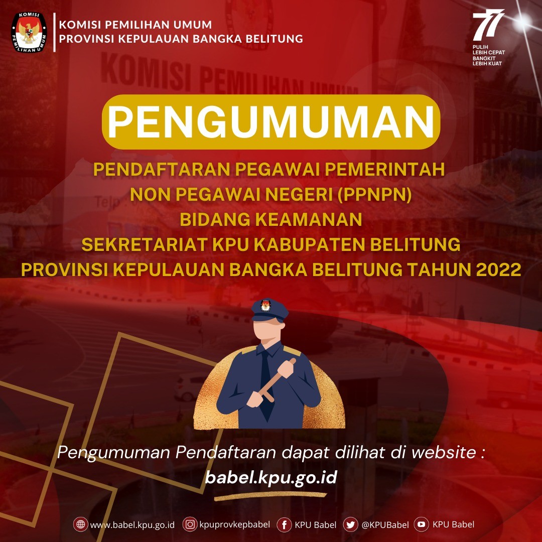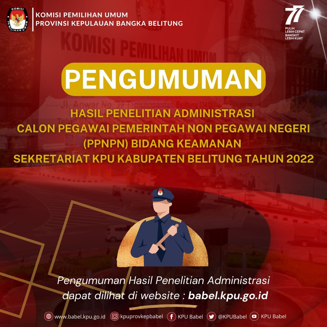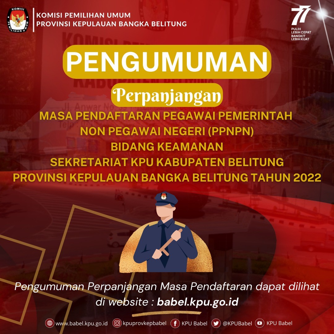 Berdasarkan Peraturan Komisi Pemilihan Umum Republik Indonesia Nomor 6 Tahun 2021 tentang Pemutakhiran Data Pemilih Berkelanjutan dan Surat Edaran Ketua KPU RI Nomor: 366/PL.02-SD/01/KPU/IV/2021 tanggal 21 April 2021 perihal Perubahan Surat Ketua KPU RI Nomor 132/PL.02-SD/01/KPU/II/2021 perihal Pemutakhiran Data Pemilih Berkelanjutan Tahun 2021, Komisi Pemilihan Umum Kabupaten Belitung mengumumkan Data Pemilih Berkelanjutan Periode Agustus Tahun 2022 pada tautan berikut:
