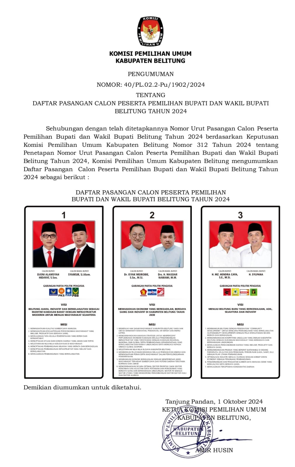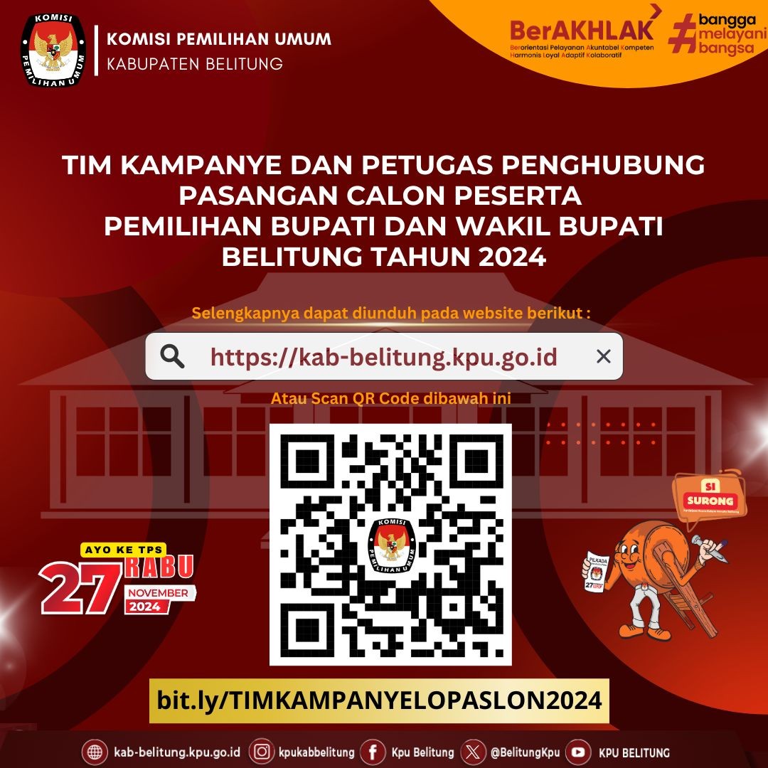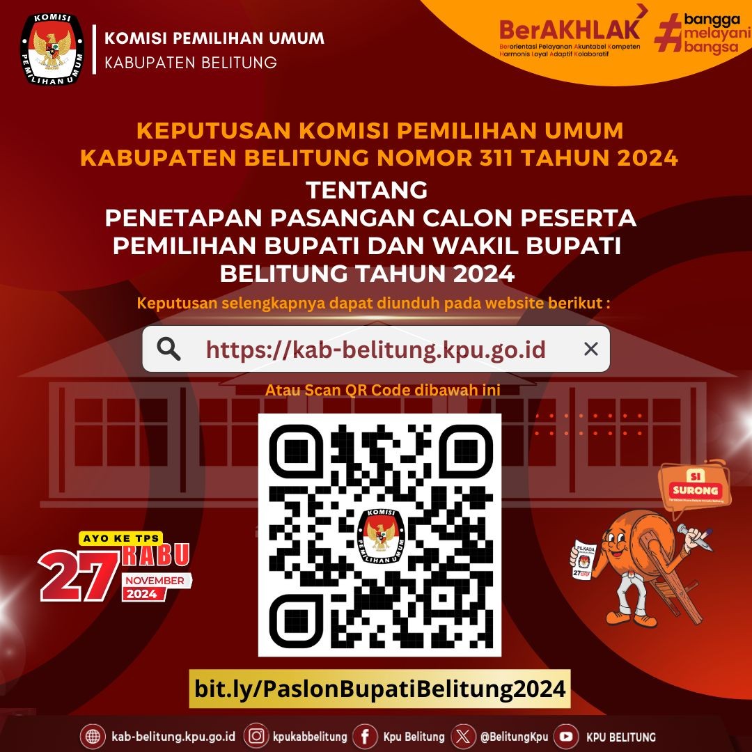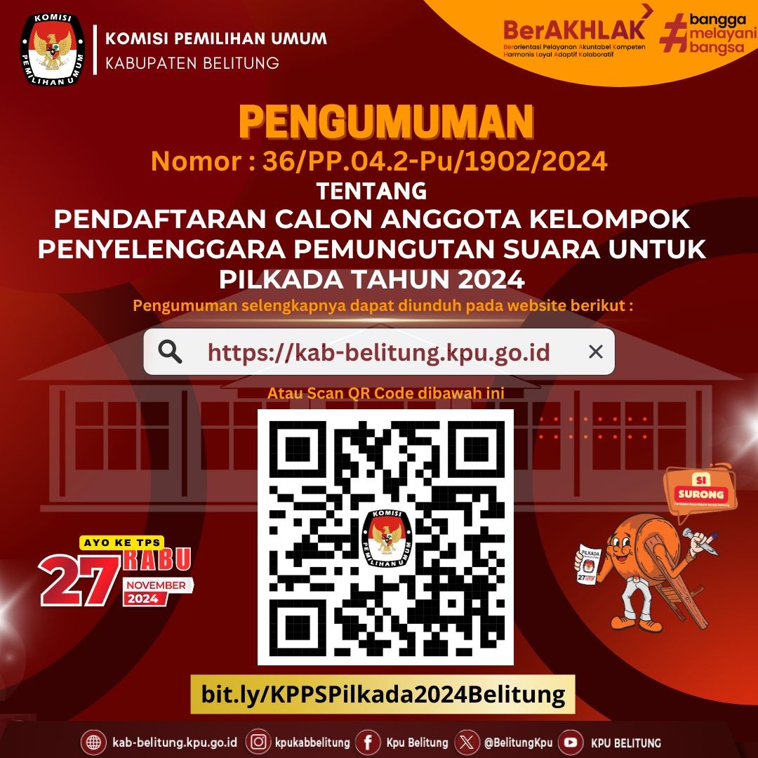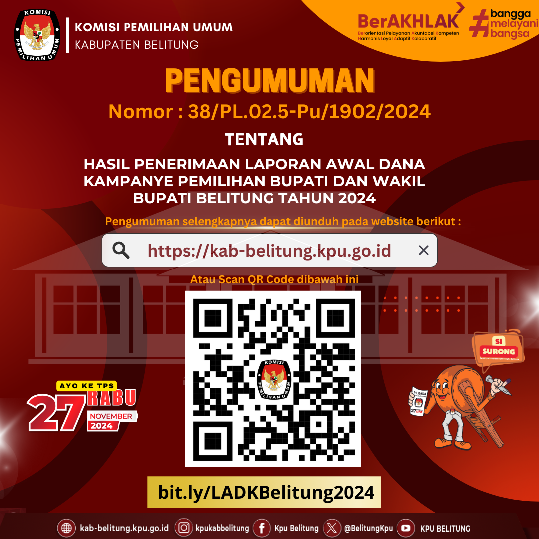 #TemanPemilih, Berikut ini adalah Pengumuman Komisi Pemilihan Umum Kabupaten Belitung Nomor 34 Tahun 2024 tentang Penerimaan Masukan dan Tanggapan Masyarakat Pasangan Calon Bupati dan Wakil Bupati Pada Pemilihan Bupati dan Wakil Bupati Belitung Tahun 2024
