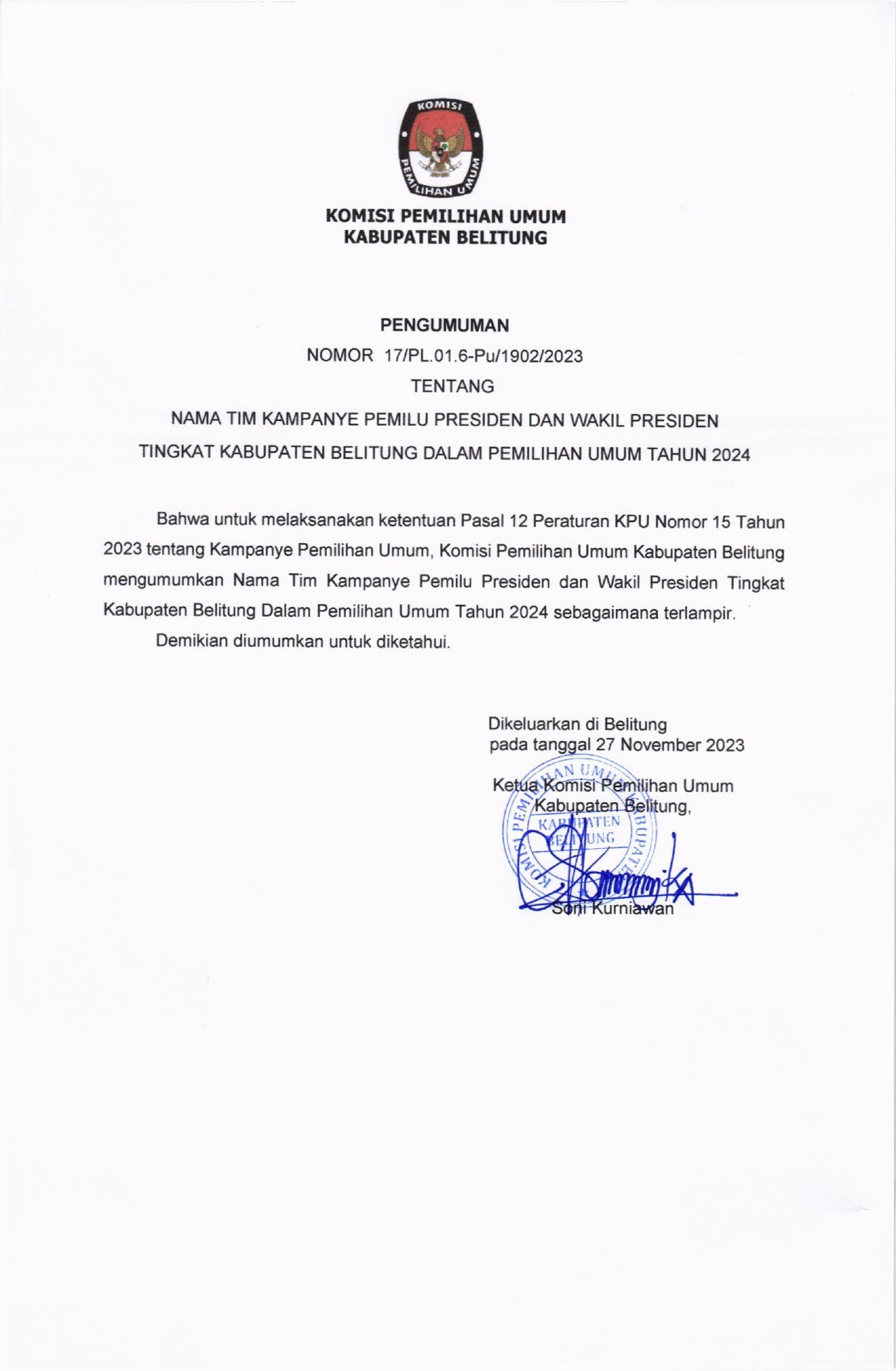 Pengumuman Nama Tim Kampanye Presiden dan Wakil Presiden Tingkat Kabupaten Belitung Dalam Pemilihan Umum Tahun 2024